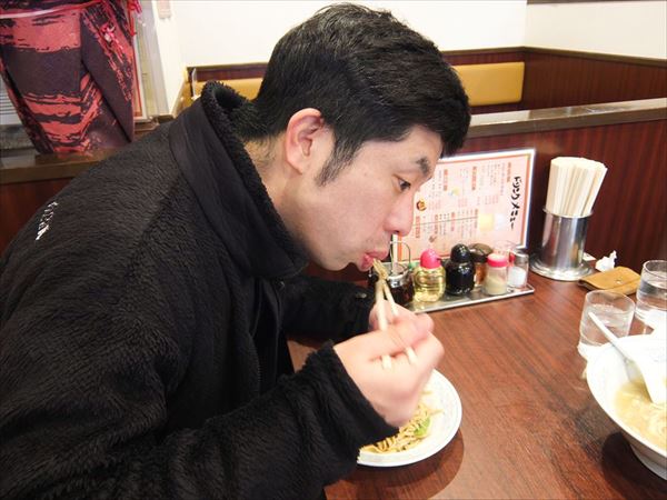 わんぱくにチャーメンをすする小島
