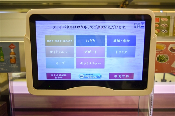 タッチパネルで商品を選び、注文すると迅速に寿司が届くシステムになっている(まだ導入していない店舗もアリ)。