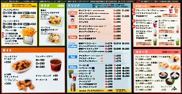 ファーストキッチン・ウェンディーズのメニューの一部
