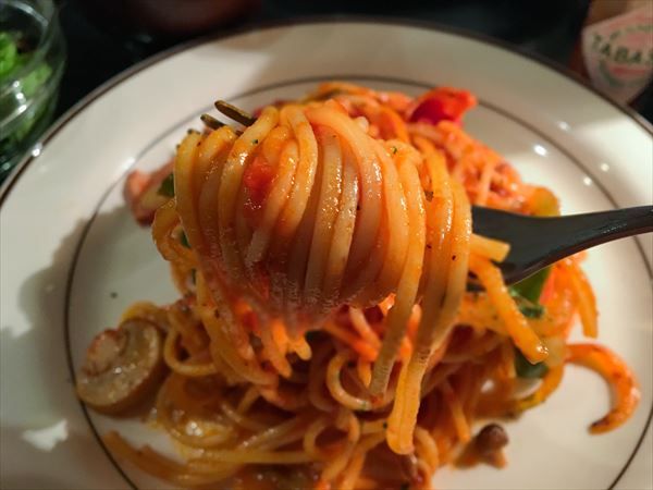 ナポリタンは思った以上にボリュームあり。ウインナー、タマネギ、マッシュルームがケチャップと絶妙に絡み合っていて、激旨。いわゆる喫茶店風ナポリタンというよりは、がっつり食べたい時に行きたいトラットリア(定食屋さん)ナポリタン。