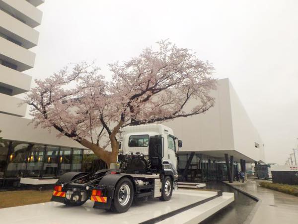 いすゞプラザに到着すると、さっそくトラックが出迎えてくれる。取材当日は桜が満開であり、大変見事な眺めだった。写真左手奥にはカフェも併設されており、ゆっくりとトラックを鑑賞しながらお茶を飲むことができる。