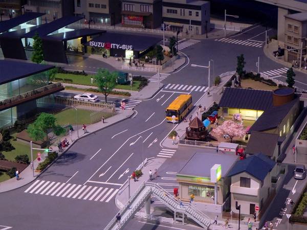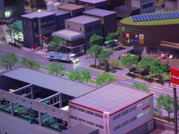 とにかくその緻密さは驚くほどであり、レールなども敷かれていないジオラマの道路を縦横無尽にトラックが走り回り、交差点の信号やクルマのヘッドライト、テールライト、ウインカーなども全て実物同様に動作する。上演中には大勢の見学者がいたが、大人も子どもも吸い寄せられるようにひたすら無言で見つめ続けていたのが印象的だった。