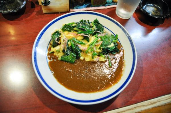 5分少々でポパイカレーが運ばれてきた。「ポパイ」とはそういうことか。ふわふわの玉子とベーコンと相まったホウレン草が主役ともいえるカレーだ。