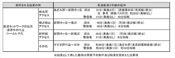 延伸が実現すれば、バスでの移動で約30分かかっている現状に比べ20分ほどの時間短縮が見込まれるほか、新百合ヶ丘方面から横浜の中心地や、新幹線が停まる新横浜駅へ行きやすくなるなどの利便性向上が期待されている。
