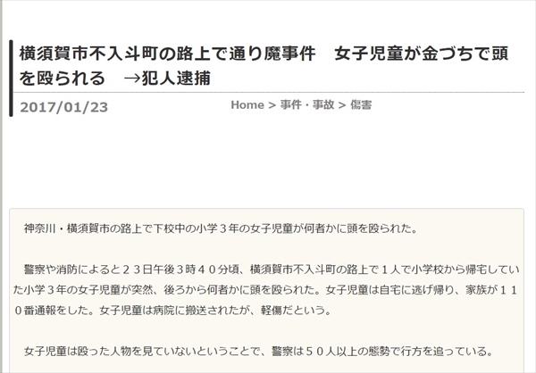 同日午後3時45分ごろ、横須賀市坂本町(さかもとちょう)1丁目の路上で、下校途中の小学校3年生の女子児童が背後から追い抜いてきた男に振り向きざまに鈍器のようなもので殴られた。