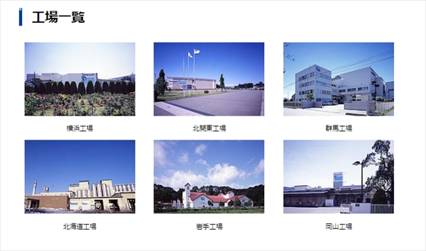 本社は横浜だが、北海道、岩手県、群馬県、岡山県など全国に工場を有し、生産から流通にいたるまでの品質管理に取り組んでいる。そして「北関東工場」とグループ会社の「あしがら乳業」では、一般人の工場見学も受け入れている。
