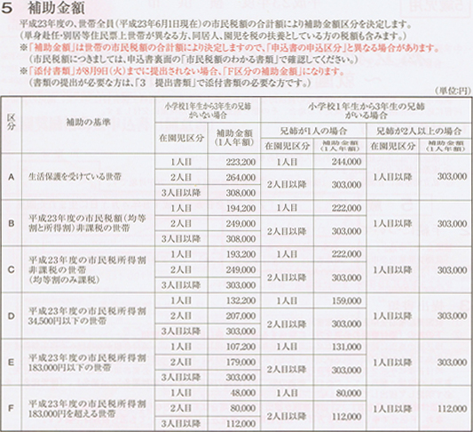 その世帯の市民税額によって補助金額が決まっている就園奨励補助金