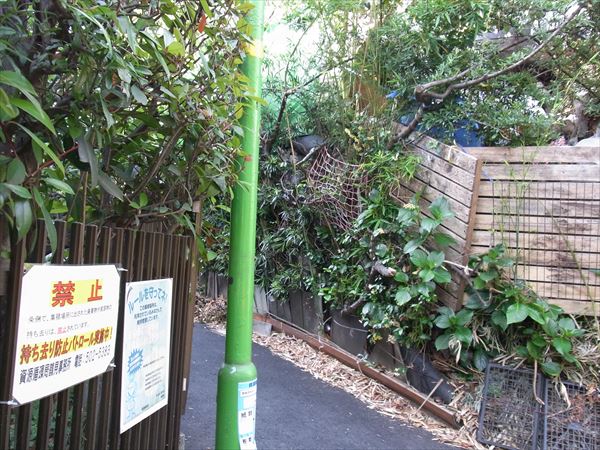 庭のあふれたごみが道路に出ないように板などで支えている