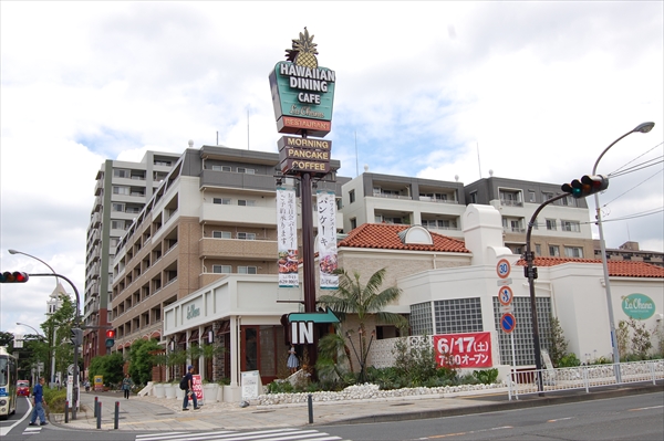 「本牧原」のバス停を降りると、イオンなどのスーパーが並ぶ大通り沿いに目立つ建物が。これがすかいらーくグループのハワイアンの新業態「La Ohana(ラ・オハナ)」日本1号店だ。