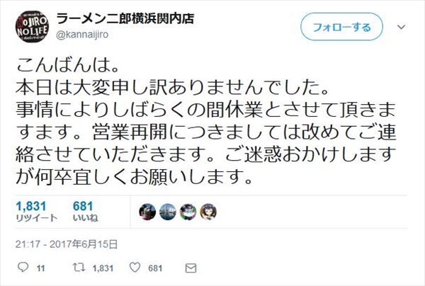 「しばらくの間休業」の告知が(ラーメン二郎 横浜関内店公式ツイッターより)