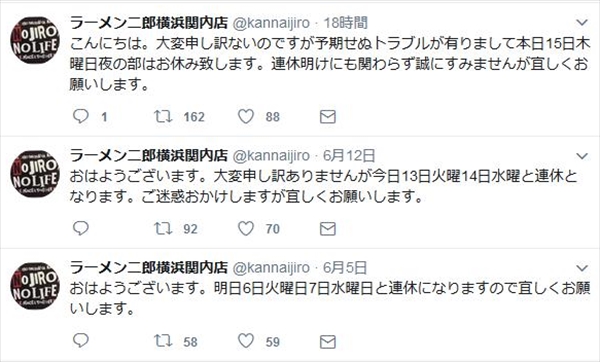 6月に入ってからも定休日以外の休みを知らせるツイートが