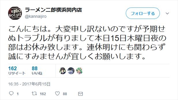 6月15日(木)の午後4時35分に投稿されたツイートによると、同日に「予期せぬトラブル」があった模様。16日午前中には店頭に休業を告げる張り紙があった。