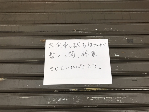 手書きで休業を告げる張り紙。シャッターは閉じている