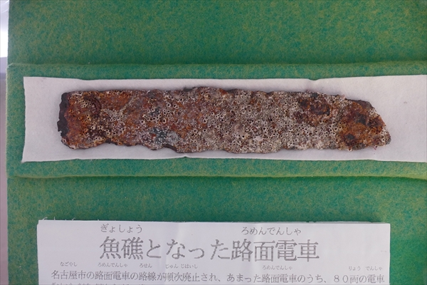 名古屋市電は1974(昭和49)年に全廃となったが、それ以前に路面電車は徐々に撤去されており、魚礁化は1969(昭和44)年には始まっていた。展示されている断片は、魚礁化から約30年後の2000(平成12)年のテレビ取材の際、海から引き上げられた車両の一部。名古屋市営「交通資料センター」に行くと、その時の番組も視聴可能だという。