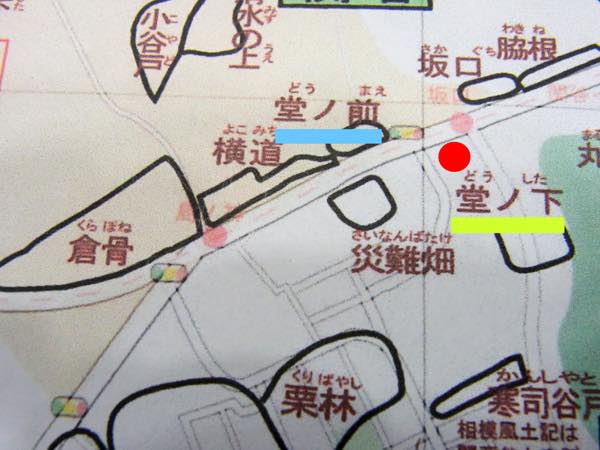 古地名地図内の地名で例を挙げると、例えば『堂ノ前(どうのまえ)』、『堂ノ下(どうのした)』は、両者の真ん中にある『関谷地蔵堂』がその名の由来になっています」
