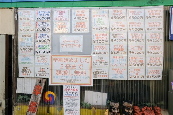 「彩」のメニューは信じられない値段で量も太っ腹。「でかっちゃん」は4玉1kgで500円、そばとラーメンがある。一度行ったらヤミツキに!