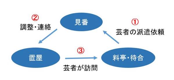 図示するとこのようになる。見番はお座敷や芸者の管理・調整を行うほか、芸者が稽古を行う場にもなる。