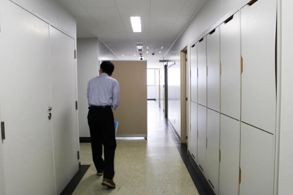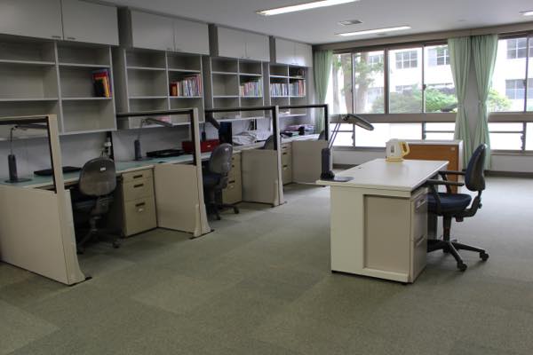 自習室の席割りは決められていて、机と椅子、本棚が左右に壁にそって4~5セット並んでいて、パーティションで区切られている。