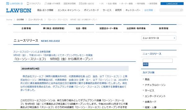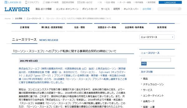 2017(平成29)年4月12日、株式会社ローソンと株式会社スリーエフの共同出資(出資率:ローソン49%、スリーエフ51%)による合弁会社「株式会社エル・ティーエフ」が「ローソン・スリーエフ」というダブルブランドで店舗を展開するというニュースが発表された。