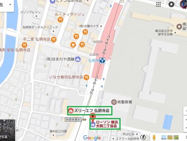 キニナルに投稿のあった、弘明寺駅前の2店舗についてだが、確かに駅前の鎌倉街道をはさんでローソンとスリーエフが向かい合っている。