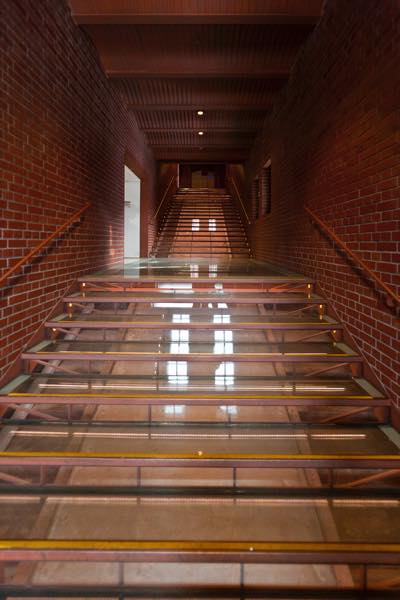 ガラス階段の下にある荷物用滑り台。館内には、昔の名残を見ることもできる