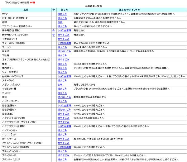 例えば、収納に使う「ラック」の分別を知りたいのに、「ラック」で検索すると「ブ『ラック』ボード」など、46件の対象項目が表示されていた。