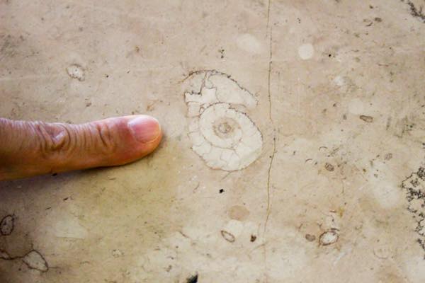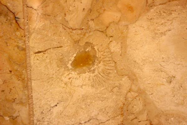 大理石や石灰岩に入っている化石は、石材になる際にどの角度でカットされるかで見える姿が変わってくる。