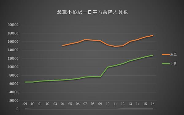 武蔵小杉駅の乗り入れ人数の推移