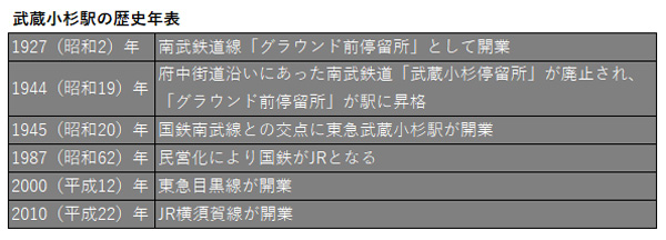 武蔵小杉駅の歴史は意外と古く、1927(昭和2)年、それまで横浜正金銀行(現:三菱東京UFJ銀行)のグラウンドがあった場所に建てられた、南武鉄道線の「グラウンド前停留場」がその前身である。