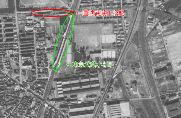 1955(昭和30)年ごろの武蔵小杉駅の上空写真(国土地理院より)