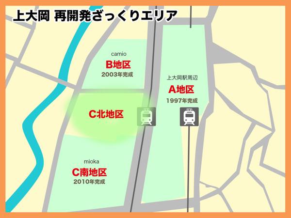 京急上大岡駅を中心として、京急百貨店・ゆめおおおかが並ぶ「A地区」は1997(平成9)年、大型複合施設「カミオ」やペデストリアンデッキなどを含む「B地区」は2003(平成15)年に工事が完了。