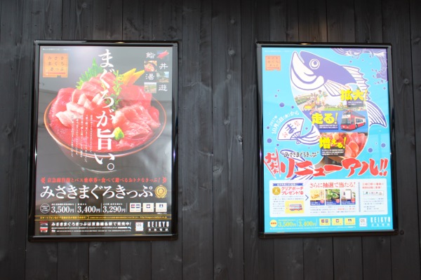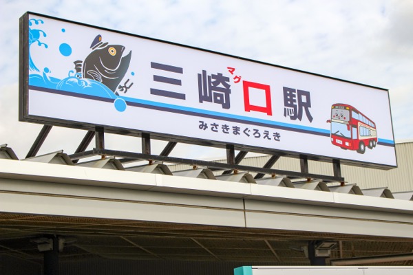 12月3日(日)までの「大大大リニューアル記念キャンペーン」中は、駅名看板も「三崎“口”駅」から「三崎マグ“ロ”駅」に変更。マグロの街、三崎を全面にアピールしている。