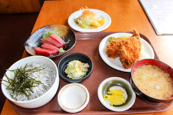地物のシラスをふんだんに使った「シラス丼」は、ふっくらしたシラスの味わいと絶妙の塩加減があとを引く一品。三崎港で水揚げされたメバチマグロを使ったお刺身は舌の上でとろける。