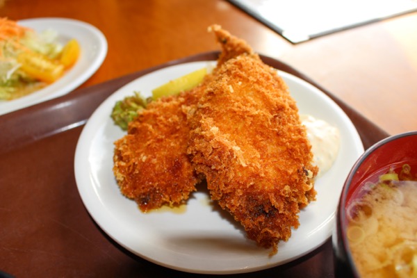 同じく三崎港で水揚げされたシイラのフライはボリュームも申し分ない。さらにマグロ汁と小鉢として地元産のキャベツを使ったコールスローがつく。
