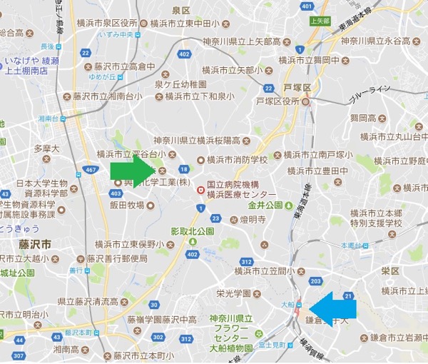 大船駅(青矢印)とドリームランドがあったあたり(緑矢印、Googlemapより)