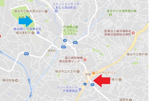 ドリームハイツ(青矢印)と渋滞で知られる国道1号線の原宿交差点(赤矢印、Googlemapより)