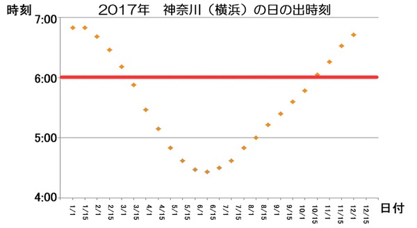 横浜の年間の日の出時間(国立天文台、暦計算室のデータより)