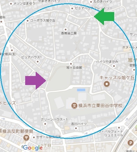 山の範囲(青枠)。船の先に見えた場所(緑矢印)。グラウンドのために削られた崖(紫矢印、Googlemapより)