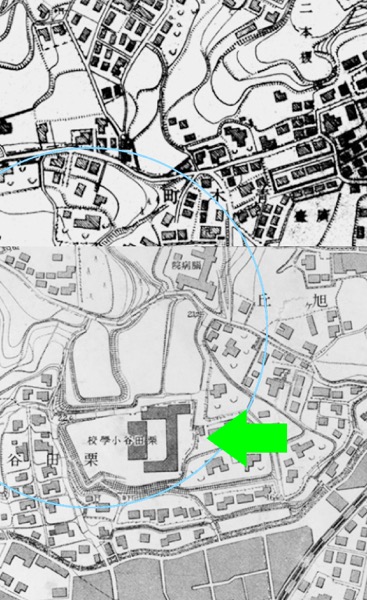 1930(昭和5)年の地図。山の位置(青枠)。栗田谷小学校(緑矢印)