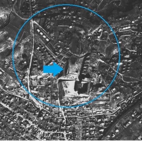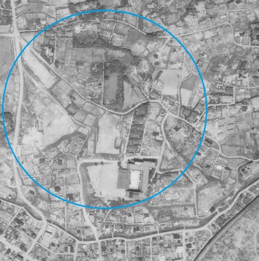 1947(昭和22)年の航空写真。山の位置(青枠)