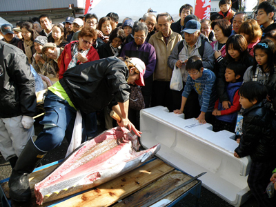 本日のメインイベント、マグロの解体ショーでは人だかりが