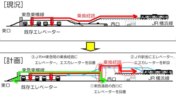 東横線からJR横浜線の乗り換えにはエスカレーターとエレベーターが使用可能になり、移動は格段に楽になった印象だ。