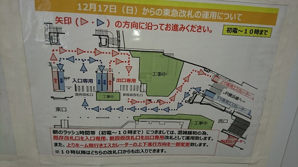 また、東横線では新設仮改札を設置。朝の時間帯(午前10時まで)は新設を出口専用、既存改札を入り口専用として運用することとしている。乗り換え専用改札は廃止になったため、乗り換えの際には一度改札の外に出る必要がある。
