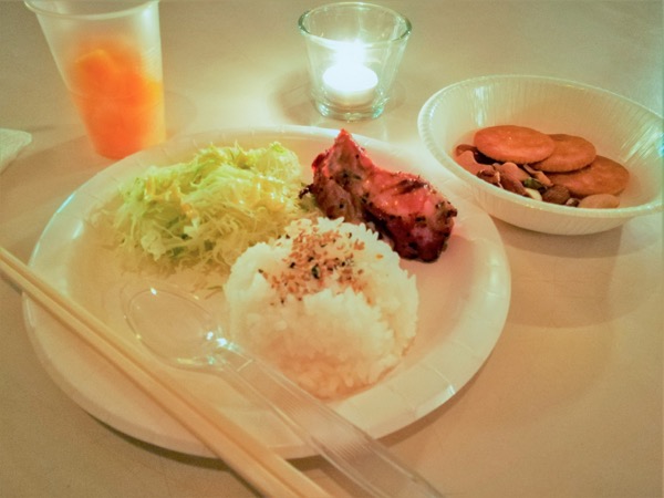 そして、取材当日のお食事は、鶏肉の煮物、サラダ、ライス、クラッカーなどのおつまみ、缶詰の果物。これらは毎回僧侶の奥様方がメニューを考え、作っていらっしゃるのだそう。