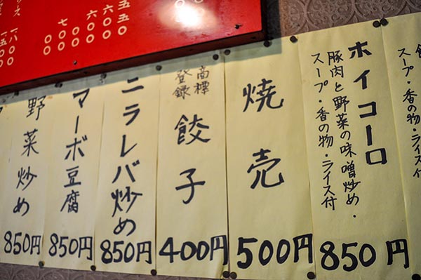 登録商標とは一言も書かれていないので、お店間違えたかなぁ・・・と思っていると、壁にかかっているメニューの下に、「登録商標 餃子」と手書きのメニューが並んでいた。