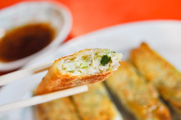 カリッとした表面は、焼き餃子というより揚げ餃子に近い。