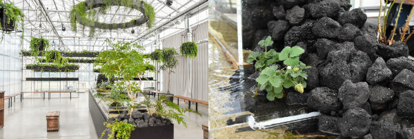 ハウス内に入ると、まずは中央に小魚たちが泳ぐ水槽が置かれた空間で説明を受ける。
