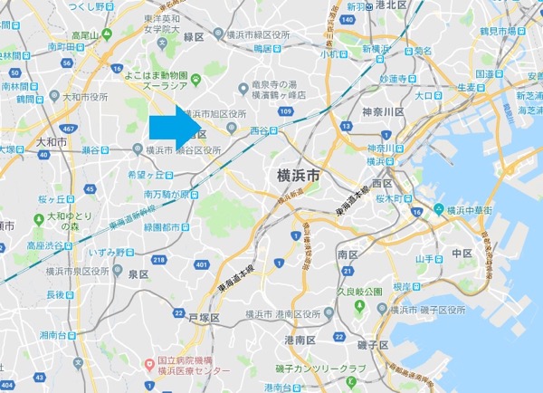 神奈川県横浜市と東京都八王子市間にある国道16号線を、旭区今宿西町付近で南側の脇道に入り、住宅地内の曲がりくねった細い道を進む。