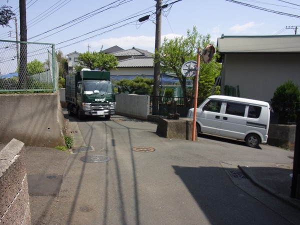 狭い道にもかかわらず大型のトラックも通る