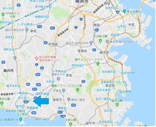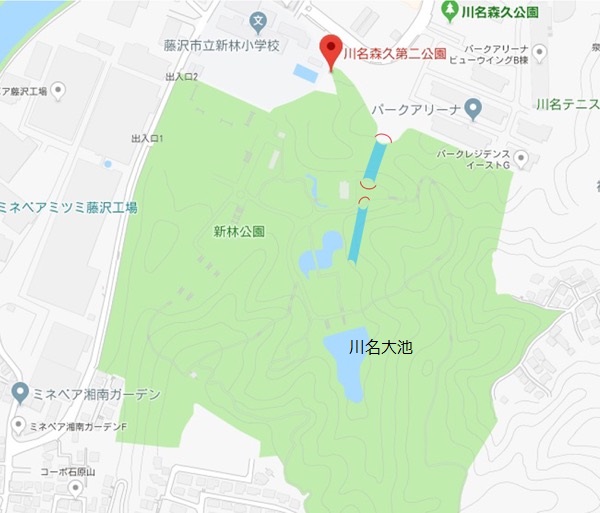 新林公園のある藤沢市川名(青矢印、Googlemapより)